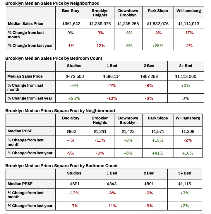- Downtown Brooklyn and Park Slope have the highest median price per square foot, and were the two neighborhoods to see an increase in the last month.
