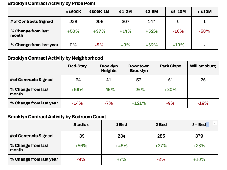- Bed-Stuy and Brooklyn Heights saw a large boost in contract activity in the last month, up 56% and 46% respectively.