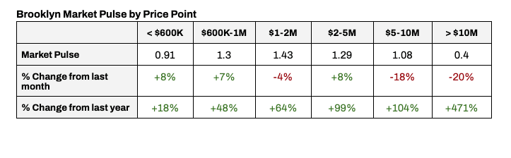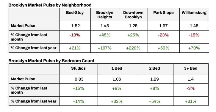 - The Market Pulse has increased the most, on a percentage basis, in Brooklyn Heights and Downtown Brooklyn to 1.45 and 1.25 respectively.