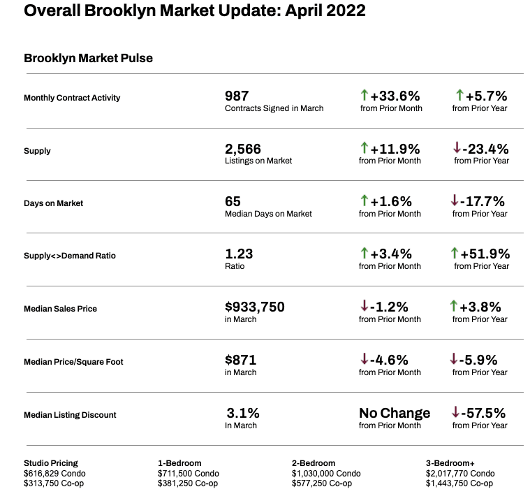 Brooklyn Buyer Activity, as measured by signed contracts, increased 34% compared to February with 987 contracts signed in March. Compared to March 2021, 6% more contracts were signed this year.