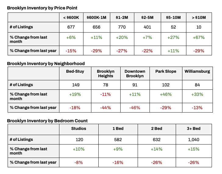 - In the last month, supply increased across all price points, neighborhoods and sizes, with the exception of Brooklyn Heights.