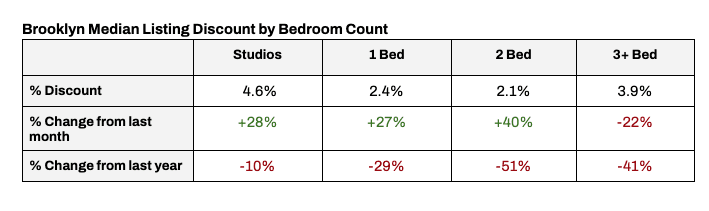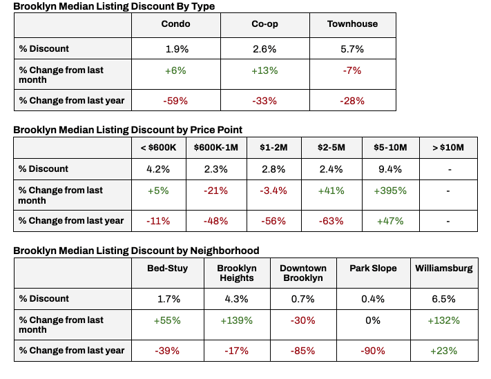- Brooklyn condos continue to have the lowest median listing discount of the building types, but have seen more negotiability compared to February.