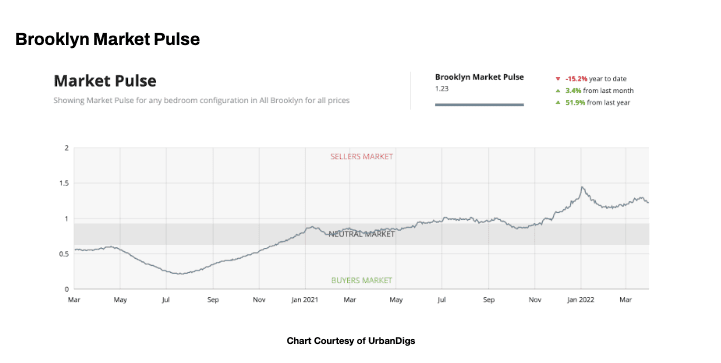 Rounding out Q1 2022, Brooklyn contract activity popped in March with 987 contracts signed, a 34% increase from February. More sellers have listed, to meet the persistent demand, with 1,340 new-to-market homes increasing overall supply by 12% compared to March to 2,566 homes available for sale. While demand is up 6% year-over-year, supply is down 24% in the same time period, which has led the Market Pulse to increase 52% over the same time period to 1.23, indicating a very strong seller’s market. The median listing discount held steady at 3.1%, the same as February, and a decrease of 57% since the same time in 2021. The median sales price dropped 1% since February and increased nearly 4% in the last year. Homes are still trading quickly, entering contract within 65 days on median, 1.5% slower than last month and 18% quicker than last year. Increasing interest rates, which are rising at the fastest rate in decades, are accelerating some buyer demand. Coupled with headlines pronouncing the continued strength of the Brooklyn real estate market — and the resurgence of NYC coming out of COVID — buyers may be having a FOMO moment and feeling intrinsic and extrinsic pressure to transact sooner.