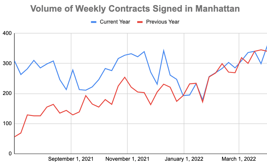 Manhattan Contracts Signed -361 contracts were signed this week, the most in a week since May 2021, and a 21% increase from last week and a 6% increase from the same week last year.