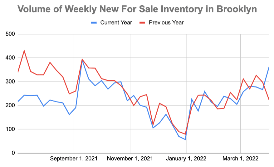 Brooklyn Supply increased 4% to 2,566 units for sale this week, the largest week over week increase in three months. This week 362 new listings came to market, a 36% increase from last week and 62% more than the same week last year.