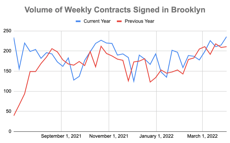 Brooklyn Contracts Signed — 236 contracts were signed this week, the most in a week since June 2021, and a 10% increase from last week and a 12% increase from the same week last year.